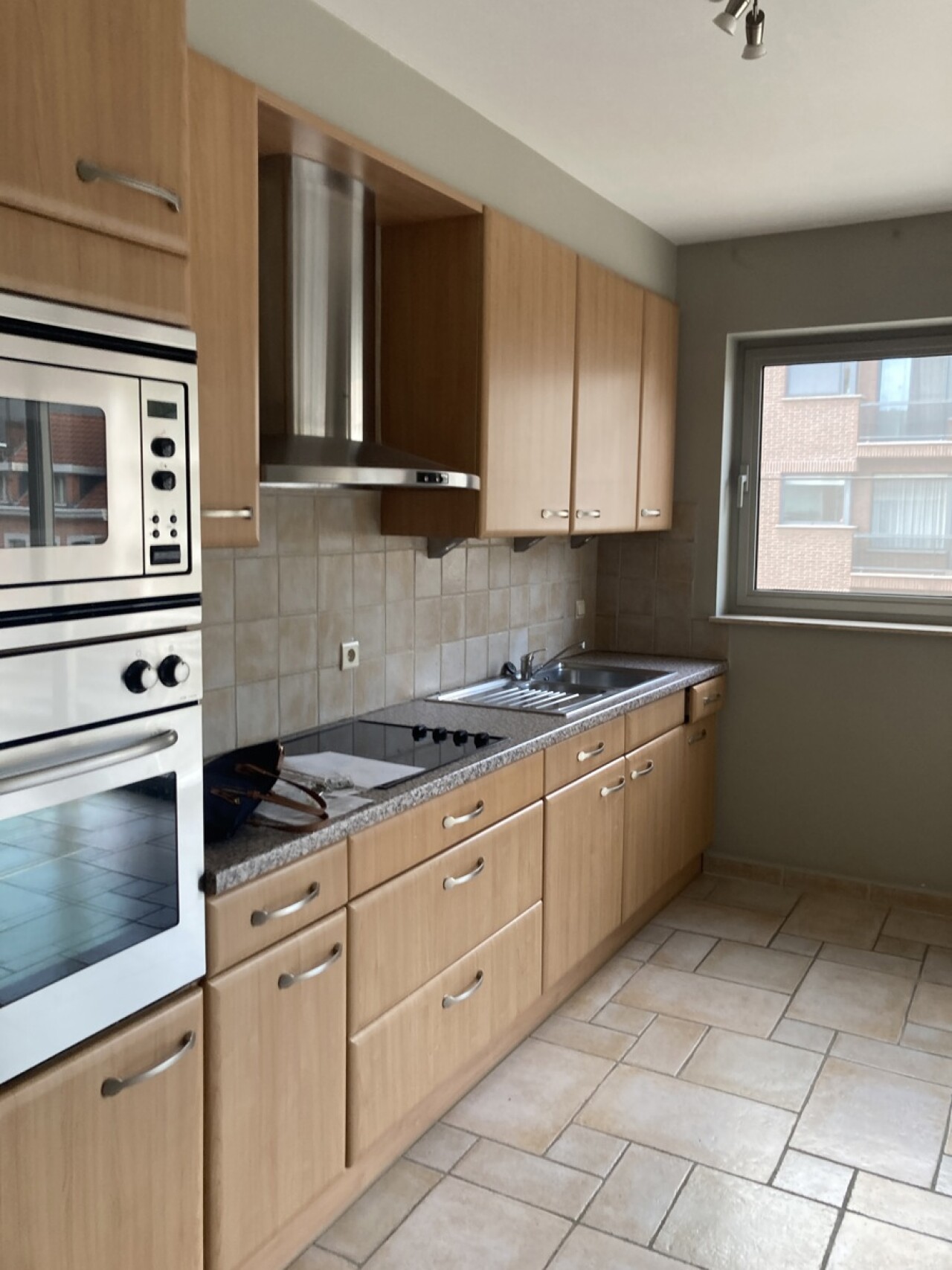 -Woonkamer met stenen vloer 41m², balkon, screens, open ingerichte keuken (ijskast, vrieskast, vitrokeramisch kookvuur, microgolfoven, oven, dampkap)