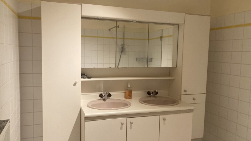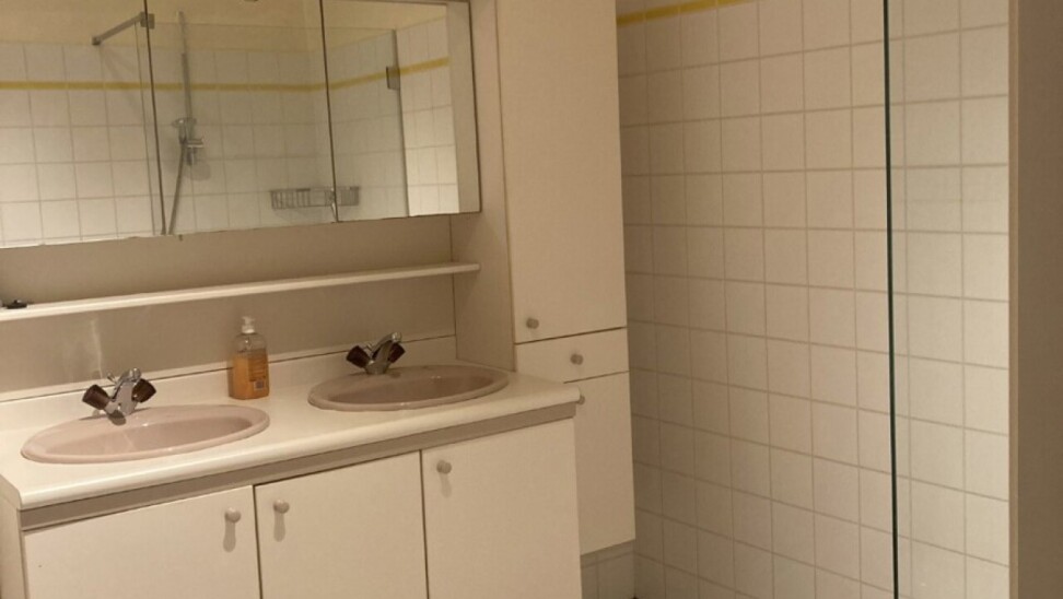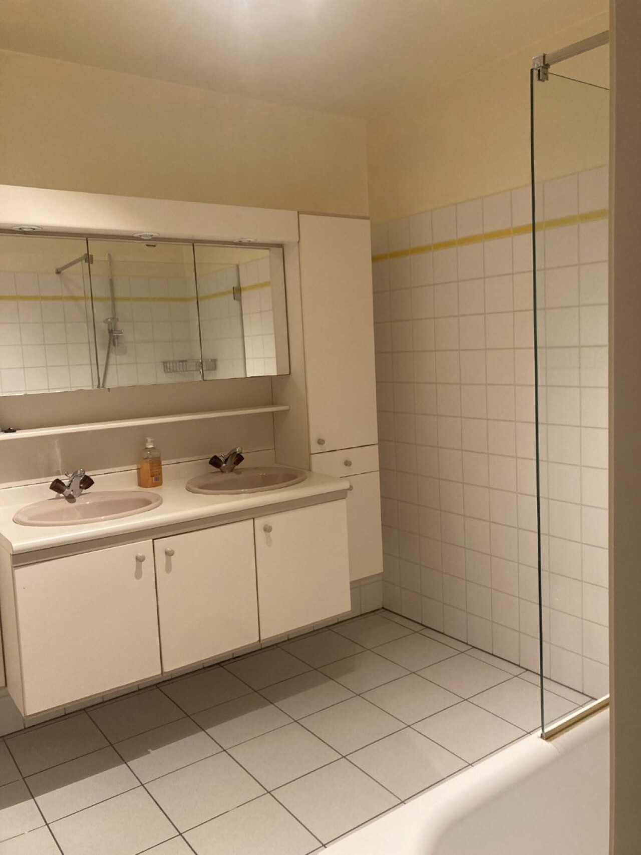 -Ingerichte badkamer met douche en meubel met dubbele lavabo.